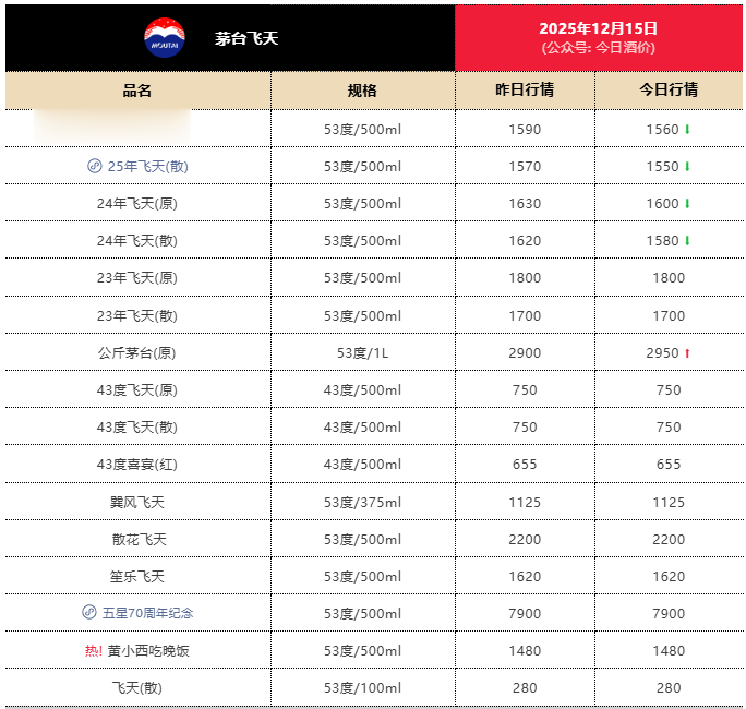 不外在12月15日,茅台酒价再度出现回落。“当天酒价”发布的数据裸露,2025年53度500ml飞天茅台原箱批发价回落至1560元/瓶,散瓶批发价为1550元/瓶,分歧较前一日下落30元和20元。