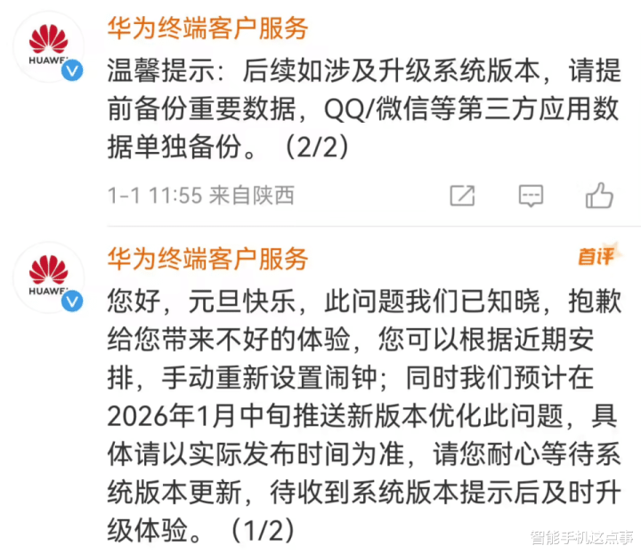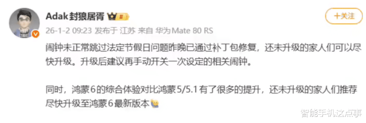 说实在的,这个Bug的罪责相配具体,在2025年12月31日(元旦假期)和2026年1月1日,本该静音的责任日闹钟,却在部分搭载鸿蒙6.0.0.120版块的开拓上不测响起。