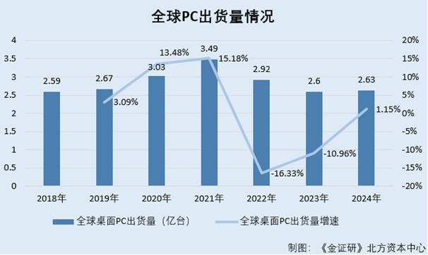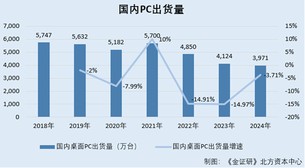 根据《金证研》朔方老本中心商榷,2019-2024年,人人桌面PC出货量增速分辩为3.09%、13.48%、15.18%、-16.33%、-10.96%、1.15%。同期,国内桌面PC出货量增速分辩为-2%、-7.99%、10%、-14.91%、-14.97%、-3.71%。