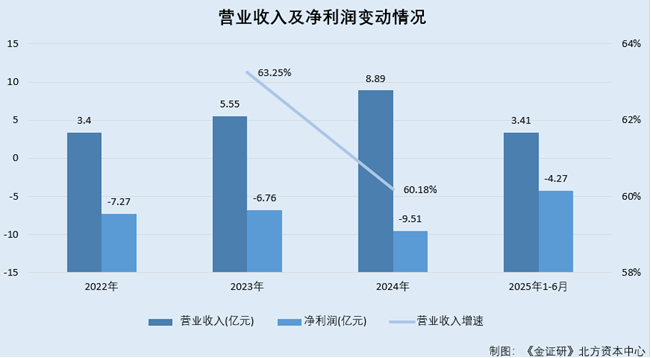 据兆芯集成签署于2025年9月19日的招股说明书(以下简称“签署于2025年9月19日的招股书”),2022-2024年及2025年1-6月,兆芯集成的交易收入分辩为3.4亿元、5.55亿元、8.89亿元、3.41亿元,净利润分辩为-7.27亿元、-6.76亿元、-9.51亿元、-4.27亿元。